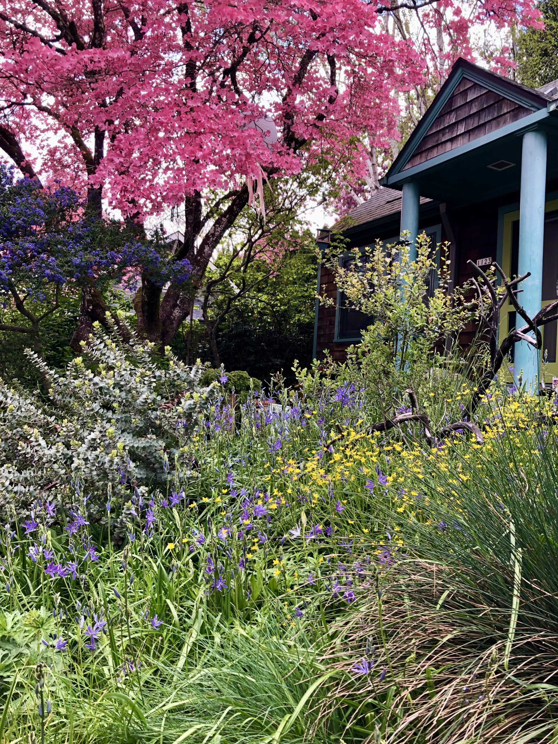 The Harney Street Prairie Garden is a decades old city-scaled version of the historic northern Willamette Valley native prairie landscape that was common before the beginning of pioneer settlement two hundred years ago. Then, in a place now called Sellwood, shortgrass prairies bloomed blue and gold and oak savannahs grew on the nearby Oaks Bottom bluffs above the Willamette River. Today, large old Quercus garryana (Oregon white oak) can still be found throughout the neighborhood; and growing nearby are new kinds of prairie habitats.