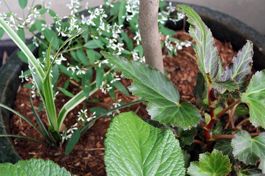 I also use ground cover in my container plantings. Just as they shade the soil and smother weeds in the ground, they do the same thing in containers. They can also echo the colors of the main containerized plant, provide a cascade down the side of a pot, and/or give you some textural contrast.