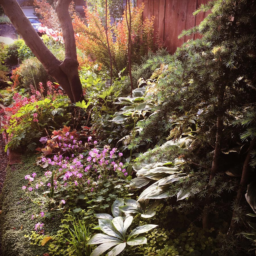 Finally, here are some photos from my own garden (a 50x100' Inner SE Portland City lot), where you can see how I use ground cover throughout -- in sun and shade, to knit together plantings, to provide seasonal color, and to cover any and all exposed ground.