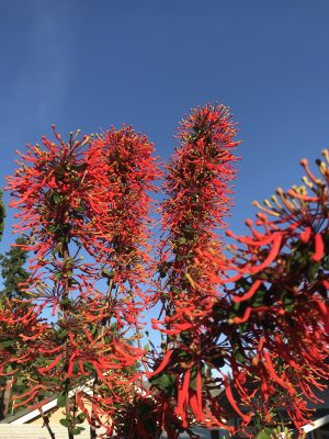 One of the small trees that always gets comments during spring open gardens is Embothrium coccineum (Chilean Flame Tree). In late spring/early summer this tree is loaded with scarlet red tubular flowers and becomes a buffet for the local hummingbirds. When not in bloom, it’s a pretty slender evergreen tree in mild winters.