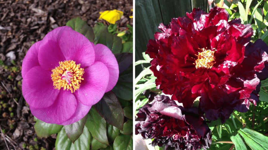 Paeonia suffruticosa 'Black Panther' —Black Panther is a semi-double flowered, midseason tree peony with nicely fragrant dark maroon flowers that often look “black” in color. The spring foliage also emerges a dark maroon with very lacey leaves.