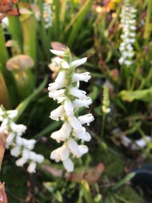I planted Spiranthes cernua (Nodding Lady’s Tresses orchid) as a bog plant to be grown in a tub along with carnivorous plants like Sarracenia and Dionaea. Spiranthes bloom very late in the season (October) here in Portland and have a spike of fragrant white flowers. Not only has Spiranthes done well in the peat bogs, it has done well in other parts of my garden too. I won’t yet call it “weedy”, but it has moved around the garden on its own and seems perfectly happy to grow in regular garden soil in much drier conditions. It’s been a fun plant to give away and other gardening friends have had success with it too. It’s super easy to pull out, so I’m not too worried about it becoming a pest.