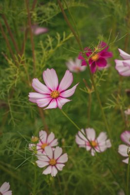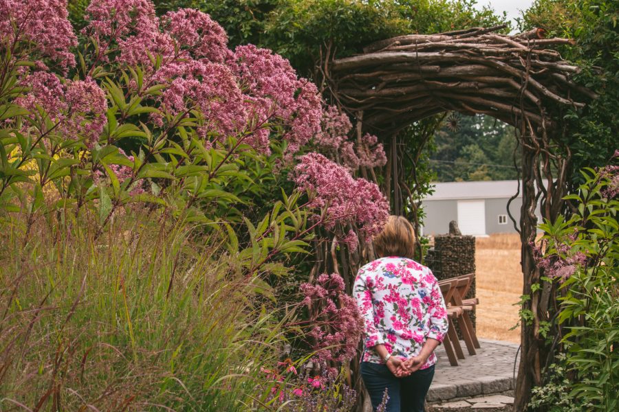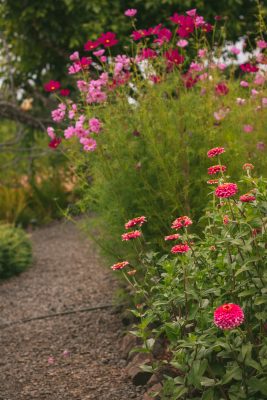 The cutting garden is filled with joyful colors. Cosmos, zinnias, celosia and more fill the beds and spill over the paths. Perennials dominate most of the garden, but this dedicated cut flower garden allows Mary to test out new annuals every year.