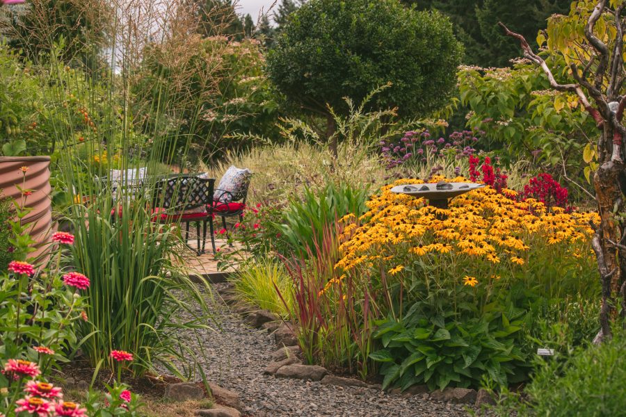 Mary and Harlan Courtney started gardening on their property in 2015 and as they gave a tour during their HPSO Open Garden day in August 2021, their excitement and love for the garden was obvious. Perched in the hills in Banks, Oregon, stunning views of the forest surround Mary and Harlan's gorgeous garden full of fun.